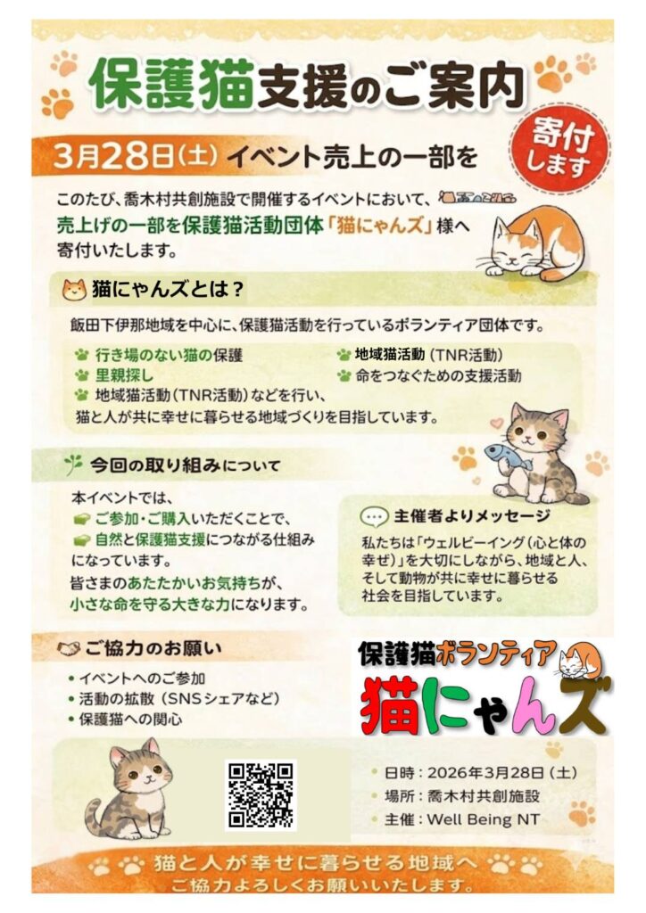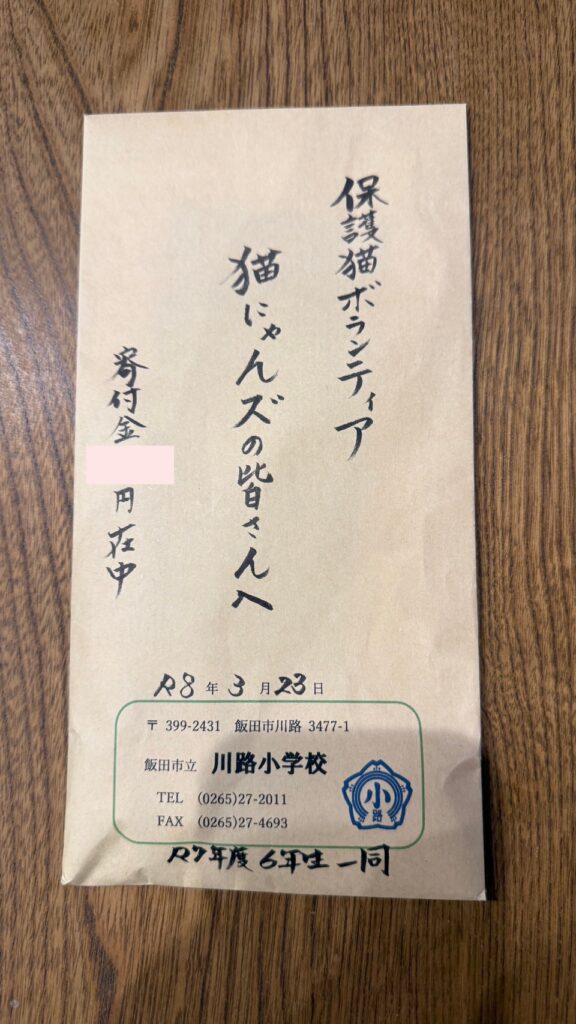 この3月に飯田市立川路小学校を卒業した子供達が、いろいろな活動の中で集めたお金を、猫にゃんズに寄付をしてくれました。また3月28日に喬木村のWell Being NT様が開催したイベントの中で、猫にゃんズのために募金活動をしてくださいました。ありがとうございました。ぜひ猫たちに会いに来てください。