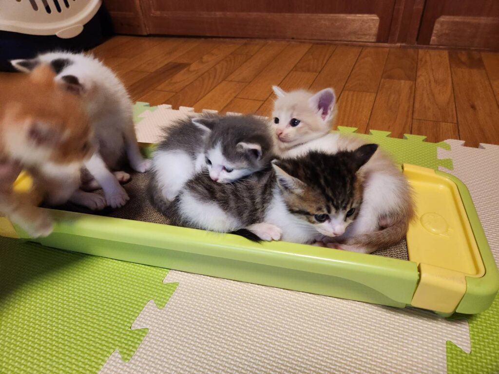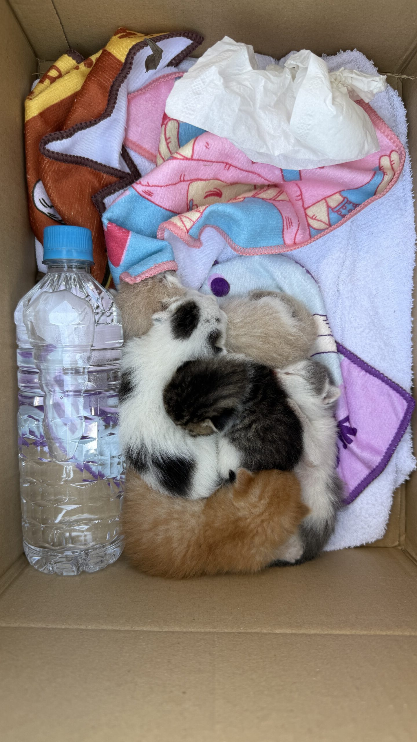 その翌日、その現場近くのコンビニの方から、「きっと昨日の母猫が産んだ子猫1頭見つけました」と連絡が入りました。母猫を保護できなかった代わりにと思い出向くと、なんと5頭に増えていました。周辺の草むらを探してくれたそうです。ちゃんとタオルを敷いて、お湯を入れたペットボトルまでそばにおいてくれてました。