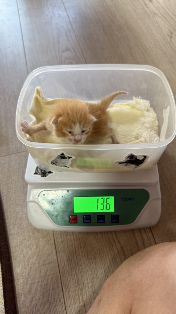ちょうど高森譲渡会の日だったので、そのままにゃんズハウスへ直行し、体重をはかり、ミルクを飲ませました。