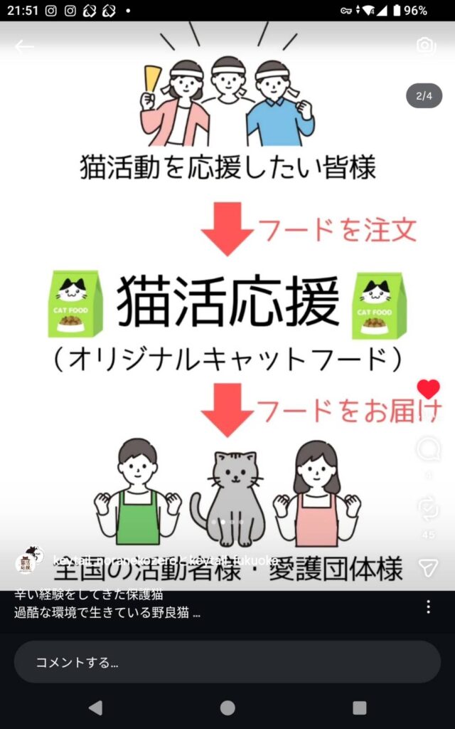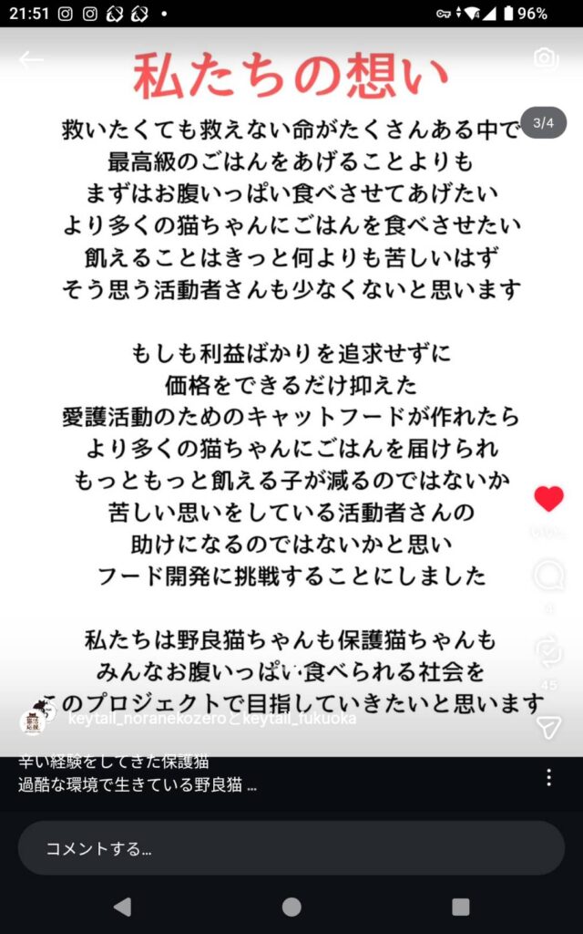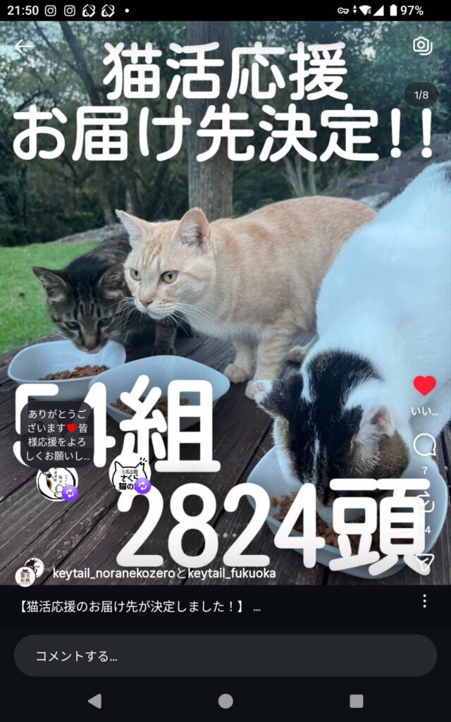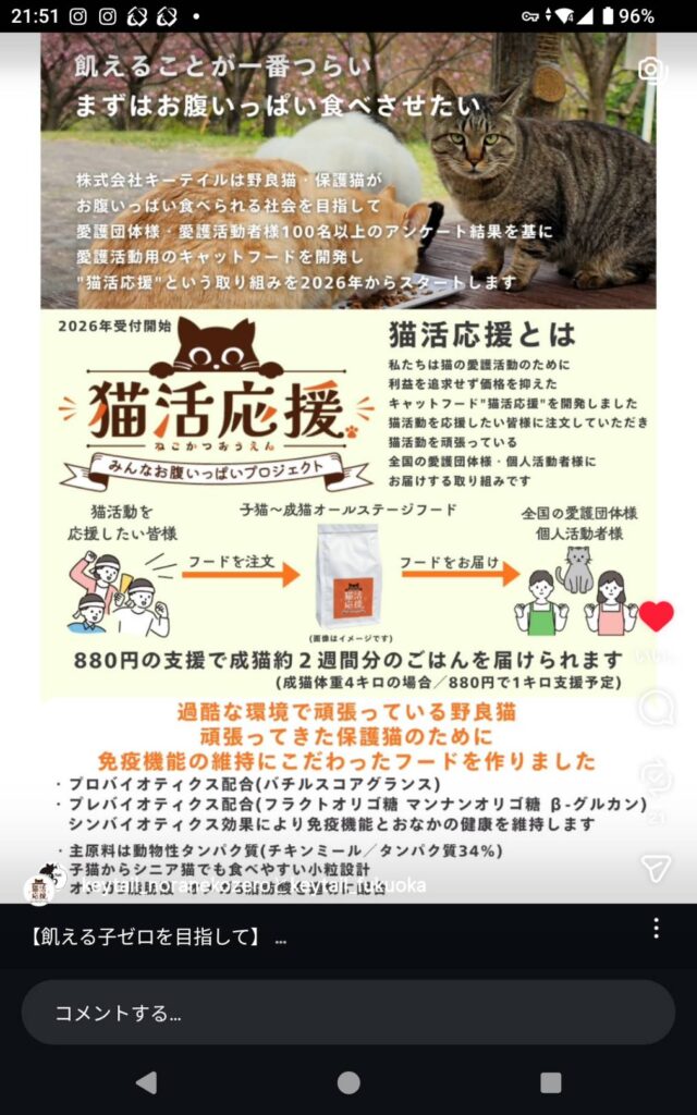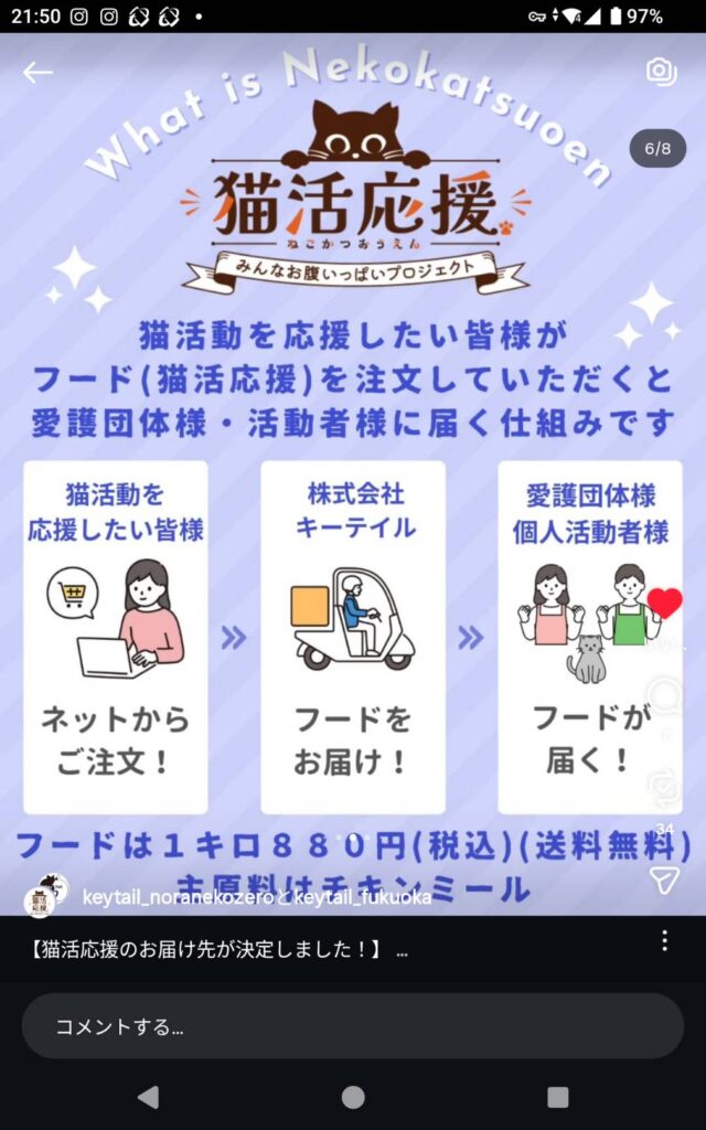 キーテイル様はキャットフード「猫活応援」を開発し、動物愛護の支援をしたい人に注文してもらい、全国の保護団体や個人で活動されている方に送る活動を始めました。