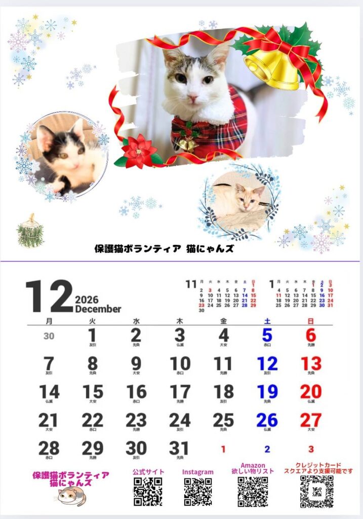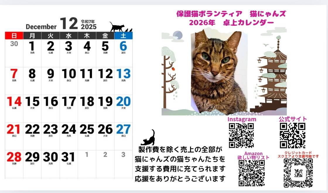 猫にゃんズ2026年カレンダー発売中です! お知らせ 2025.11.20 猫にゃんズカレンダー、完成しました。活動を始めて4年目で初めての試みです。SNS担当者が仕事中に精魂込めて作り上げました。譲渡会やマルシェ、猫神様縁日などで販売しています。どうぞお買い求めください。卓上タイプと壁掛けタイプの2種類あって、それぞれ1200円です。よろしくお願いいたします。
