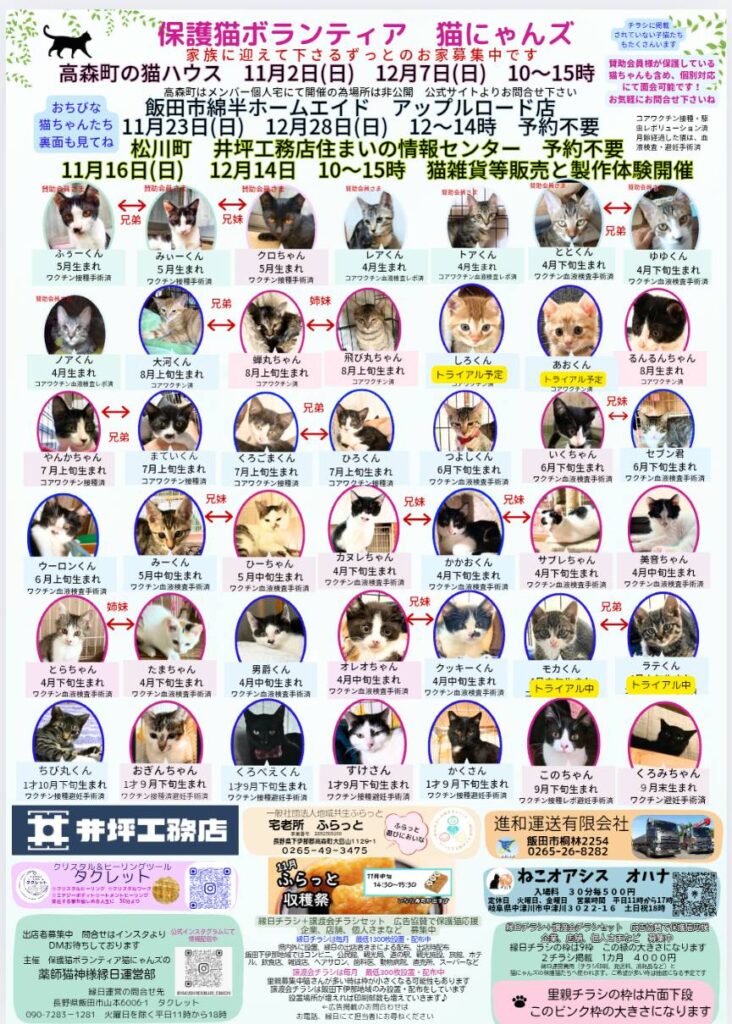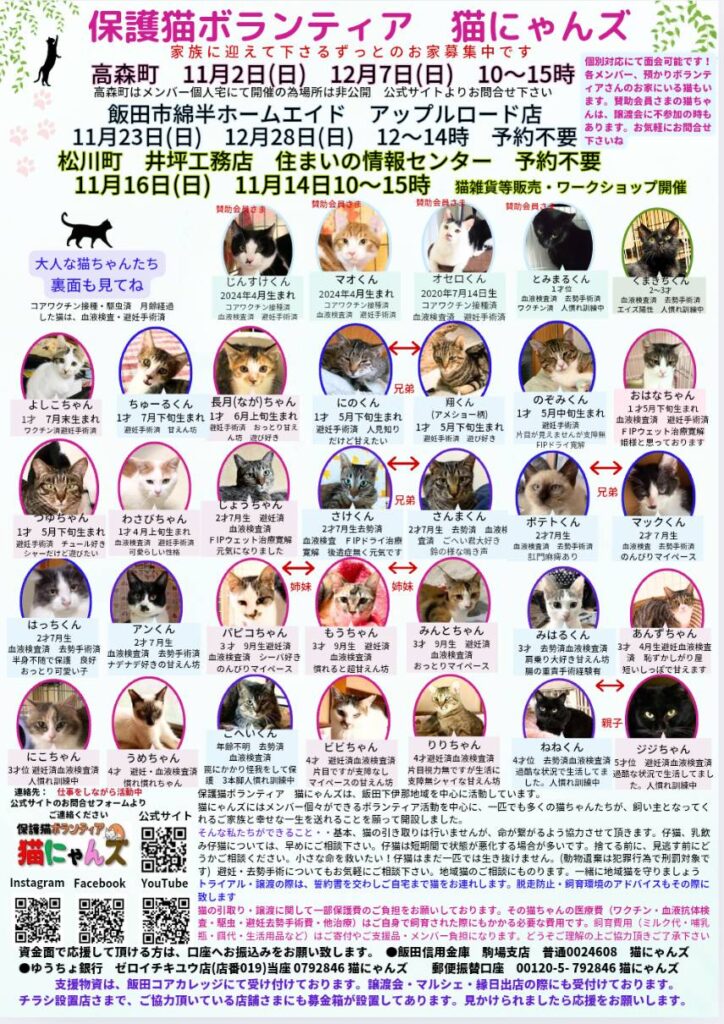里親さん募集中!! [showwhatsnew] 2025.05.242025.10.25 10月25日版の里親さん募集チラシです。まだこのチラシに掲載していない子猫もたくさんいます。ワクチン接種したと、譲渡可能になったらチラシや譲渡会にデビュー予定です。高森譲渡会では、運が良ければ会うことができます。 ずーっとのお家が見つかった猫たちはこちら! PDFはこちらからダウンロードしてください。