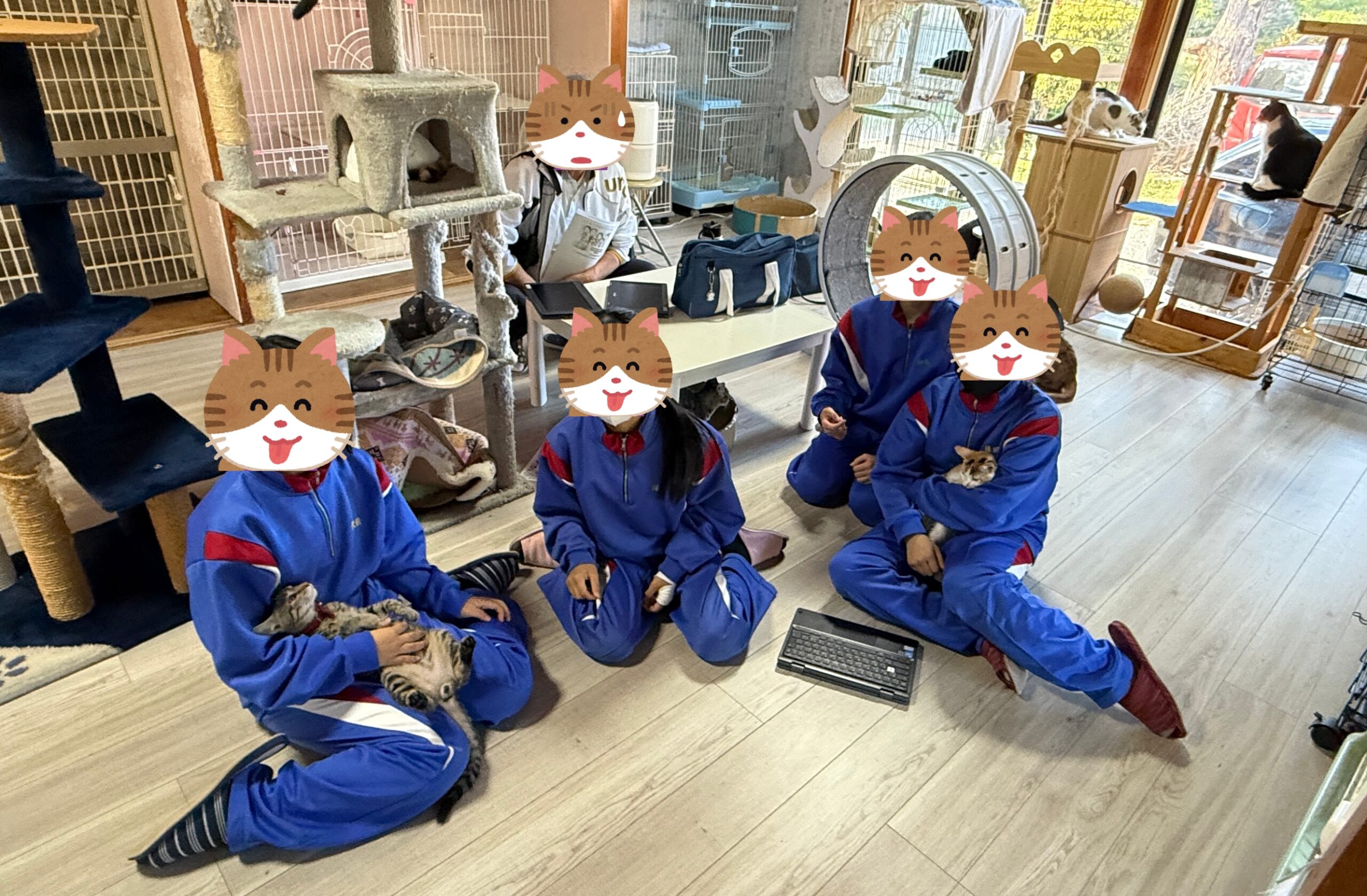 今日は高陵中学校の生徒さんが、探究学習の一環として保護猫施設を見学したいと、わざわざ電車に乗って遊びに来てくれました。